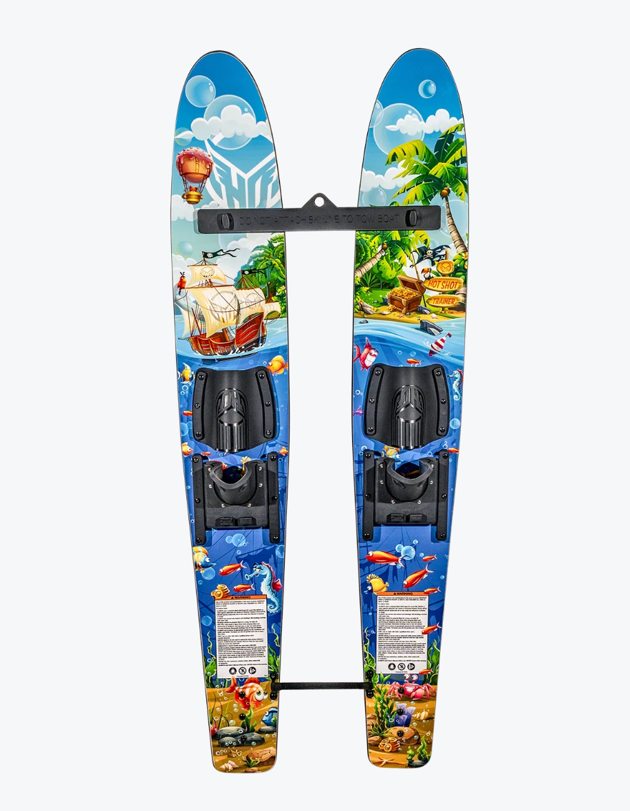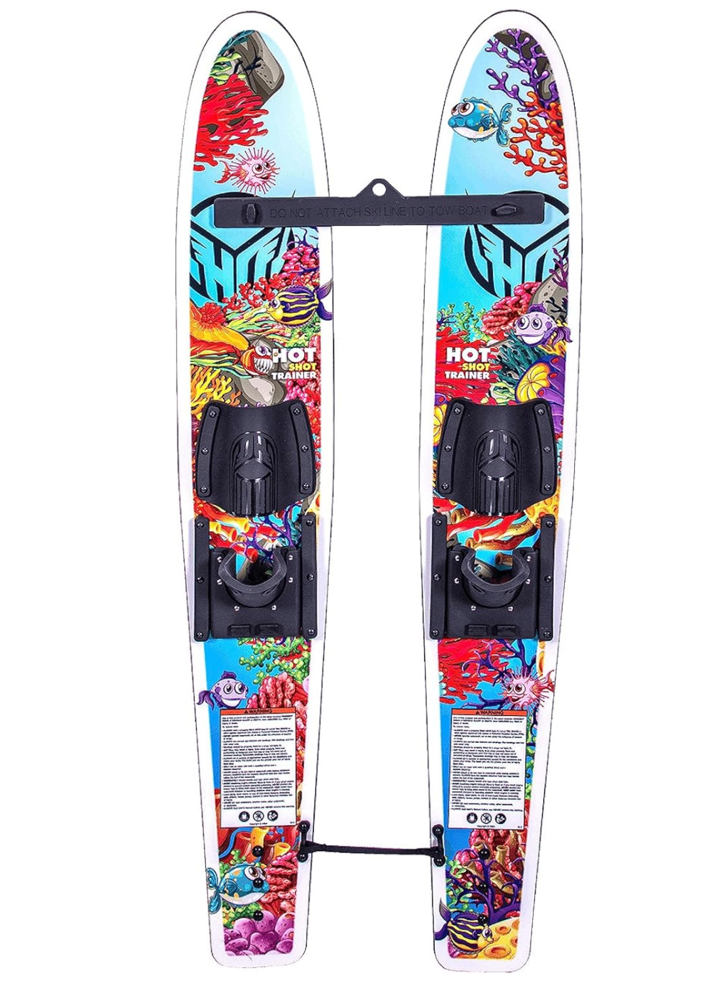 The Hot Shot Trainers are THE perfect skis for our aspiring waterski pro! With a package that includes a trainer bar and tail connection, your junior skier will have the most stable platform for learning to ski. In addition, the Hot Shot Trainers include a parent hand held rope system allowing the parent in the boat to control their little skier’s ride. Adjustable horseshoe bindings fit a wide range of kid’s feet sizes and bright graphics keep little skiers visible in the water. The perfect toy to teach the future generation of water sport enthusiasts.Â